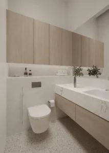 • Toilets with vanity counters and shower enclosures