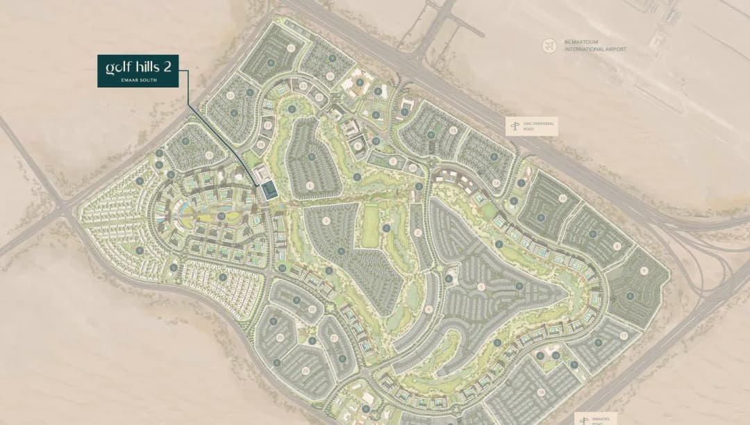 Golf Hills 2 is located in Emaar South, Dubai. This community is strategically situated near the Expo 2020 site and Al Maktoum International Airport, offering residents convenient travel and excellent transportation connectivity to the rest of Dubai. Emaar South is designed with a focus on a harmonious living environment with well-maintained parks and green spaces.