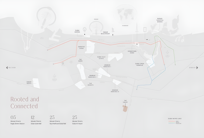 Vindera is located within The Valley, a master-planned community by Emaar situated on the Dubai-Al Ain Road. This strategic location provides a peaceful escape from the city's hustle while maintaining excellent connectivity. Key highways ensure easy access to Downtown Dubai, Dubai International Airport, and other major landmarks. The community is near the Sevens Stadium and is a short drive from Dubai Outlet Mall and key business and leisure hubs.